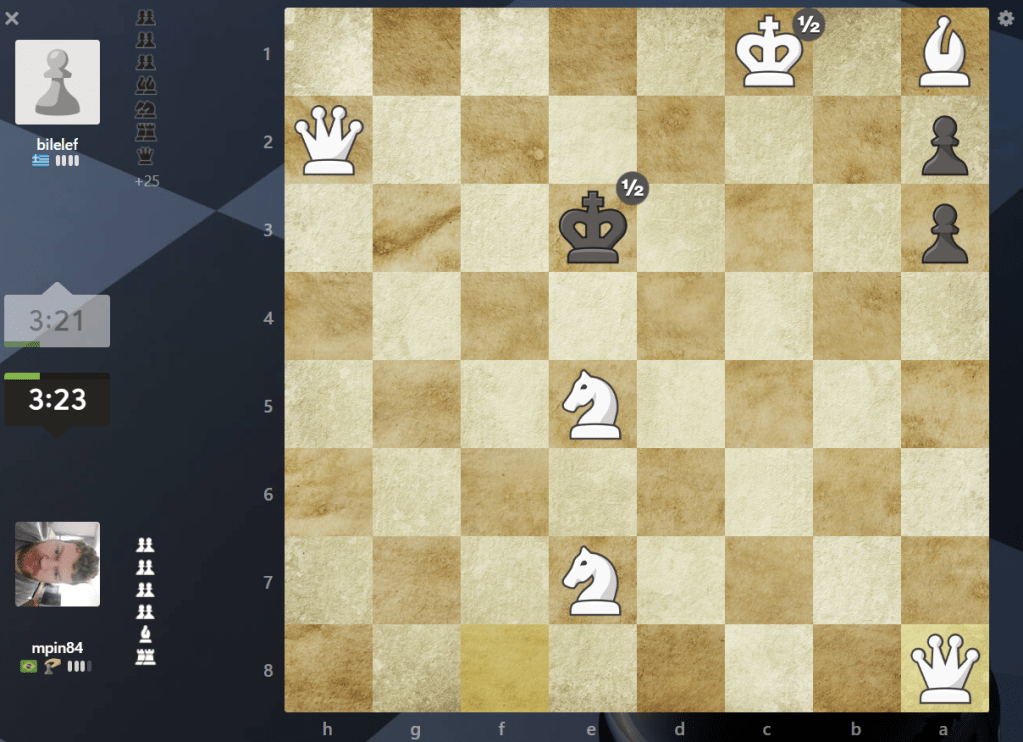 E depois de ter torturado vocês com essas capivaradas, encerro com uma pintura: na partida Niemann-Maze, de 2020, o primeiro vence a partida contra o Grande Mestre sem capturar uma única peça. Uma aula de jogo posicional, de como não se expor mais do que o necessário, de como ganhar tempo. Subjugar o adversário com um garfo na hora certa pode ser mais satisfatório do que um mate.