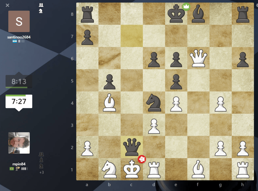 Aqui, o oponente, de pretas, estava indo bem, sem grandes destaques, tendo condições de dar xeque e preparar o mate. Em vez disso, ele perdeu tempo capturando um peão solitário no centro. Como assim? Mesmo tendo meu cavalo capturado de bobeira pelo rei no lance 14, aí tudo se perde para o adversário, com o rei completamente exposto e quatro peças de ataque presas, sem poder apoiá-lo. Mesmo assim, eu quase estraguei tudo, e salvei minha vitória com a dama invadindo a fileira adversária.